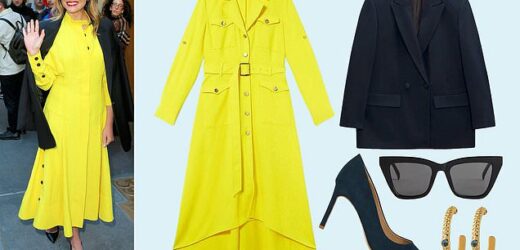 Elizabeth Olsen pictured looking radiant as ever in a bright yellow dress as she arrives at NBC in New York City