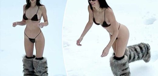 On Thursday the leggy model, 26, posted a trio of cheeky photos of herself clad only in a skimpy black bikini and furry boot while frolicking in the snow.
