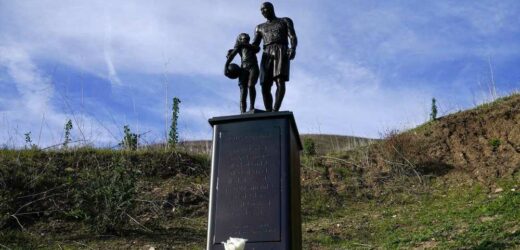 The brass monument shows Kobe wearing his Los Angeles Lakers uniform and smiling down at Gianna with his arm around her. The base is inscribed with the phrase: “Heroes come and go, but legends are forever.”
