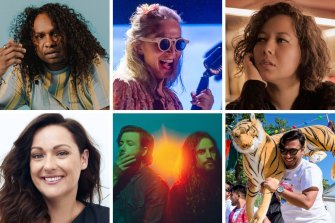 What to see and do in May (clockwise, from top left): Baker Boy, Girl From the North Country, Mahalia Barnes, the South Asian Festival, Holy Holy and Celeste Barber.Credit:Daniel Boud, Wilk, Elly Speer