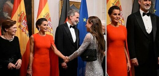 Queen Letizia dazzled in a vibrant red gown as she took to the red carpet with King Felipe at the presidential Bellevue Palace in Berlin this evening.