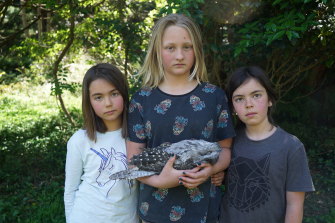 Bon Madden, Millie Schulz and Monty Madden with a dead tawny frogmouth owl.