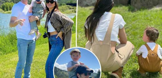Olivia Munn twinned with 18-month-old son Malcolm during a family vacation in Idaho with partner John Mulaney, with the duo matching in khaki bibs, white T-shirts and work boots.