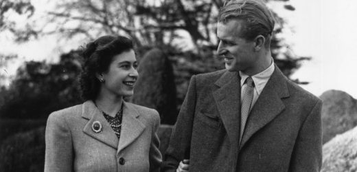 A sweet portrait shows the then Princess Elizabeth, aged 21, linked arms with Prince Philip, aged 26, with the beautiful brooch on her lapel.