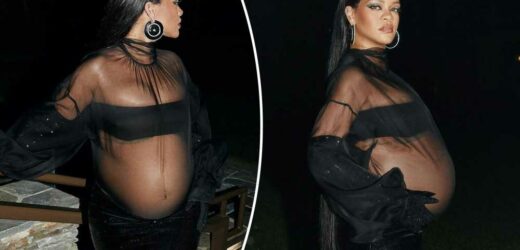 Rih, 34, proudly showed her growing baby bump in a high-necked, see-through organza top with a black bandeau underneath at the Chateau Marmont party on Sunday night.