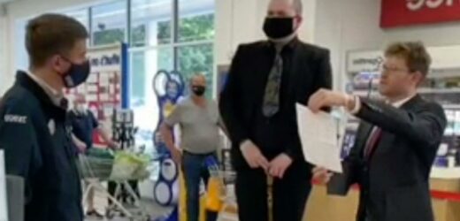 An employee in a Tesco jacket stands in front of them and listens while shoppers stroll past in the background.