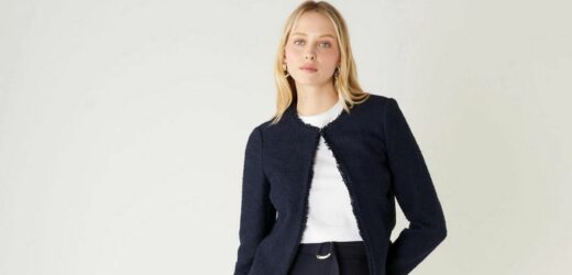 For a slightly different silhouette, Boden’s textured tweet jacket offers a more fitted shape complete with oversized lapel and statement buttons on the front. It’s also a slightly cropped, stopping at the waist rather than the hips, although has the same raw hem details.