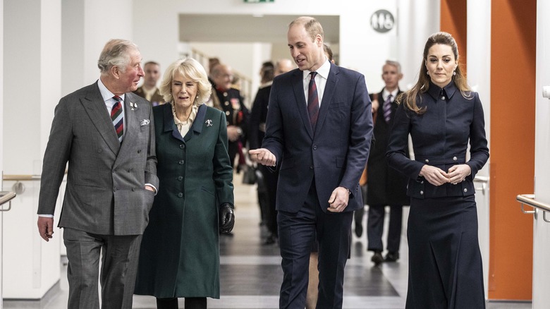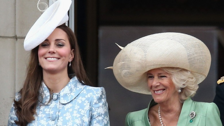 When you attend hundreds of public events a year, something is bound to go wrong. Fortunately, both Kate Middleton and Camilla Parker Bowles are able to laugh at life’s mishaps. One such moment occurred at the 2019 Trooping of the Colour, when Prince Louis, Kate’s youngest son who was just over a year old at the time, got a little too excited waving his arms about and nearly knocked Camilla’s hat off (via Hello!). But no need to panic: Both mom and grandma found it funny. At a previous fly-past in 2018, this time to mark the 100th anniversary of the RAF, Prince Charles had a wardrobe malfunction involving his jacket. Charles, Kate, and William had a good laugh about it as Camilla managed to sort the issue (via Good Housekeeping).