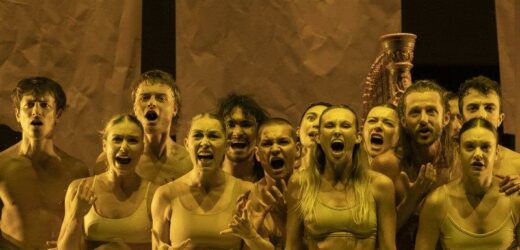 And the program does have some quiet moments. Stephanie Lake’s The Universe is Here begins with solo harpist Emily Granger centre stage, hardly sounding the instrument. The 14 dancers emerge from the darkness and walk forward in a line, slowly and deliberately, making patterns of small moves.