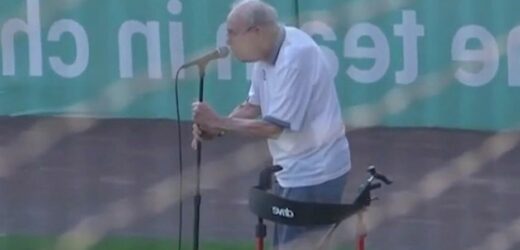 John Pylman, 96, a WWII veteran, delivered his rendition of “The Star-Spangled Banner” on Aug. 5 before the West Michigan Whitecaps played a home game in Comstock, Michigan.