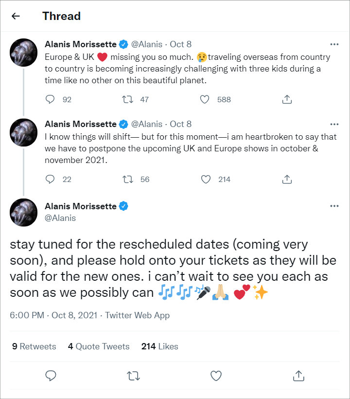 “I know things will shift – but for this moment – i am heartbroken to say that we have to postpone the upcoming U.K. and Europe shows in October and November 2021.”