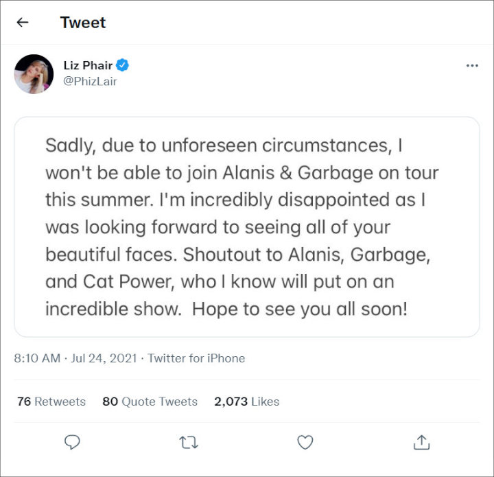 The tour postponement came months after supporting act Liz Phair had to drop out. “Sadly, due to unforeseen circumstances, I won’t be able to join Alanis & Garbage on tour this summer,” she tweeted in July.