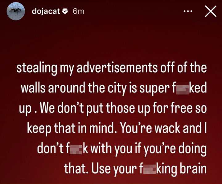 The 27-year-old slammed the thief on her Instagram Story. “Stealing my advertisements off of the walls around the city is super f**ked up,” she ranted in the now-deleted Story. “We don’t put those up for free, so keep that in mind. You’re wack, and I don’t f**k with you if you’re doing that. Use your f**king brain.”