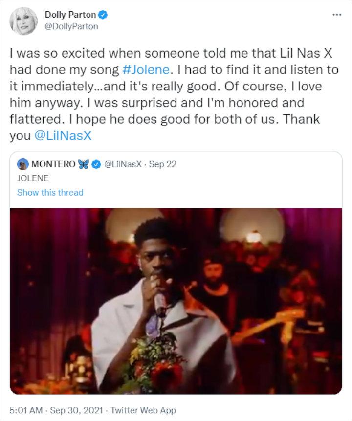 Dolly went on to note, “Of course, I love him anyway.” The “Islands in the Stream” songstress continued gushing over Lil Nas X’s performance, “I was surprised and I’m honored and flattered. I hope he does good for both of us. Thank you @lilnasx.”