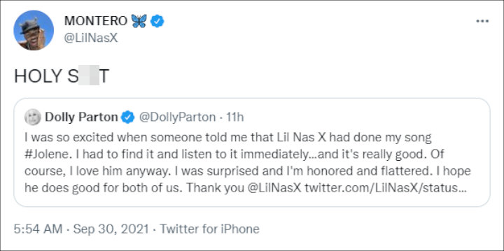 Upon learning the positive feedback from Dolly, Lil Nas X later retweeted the Twitter post. The 22-year-old Grammy-winning artist also added a quote to Dolly’s tweet that read, “HOLY S**T.”