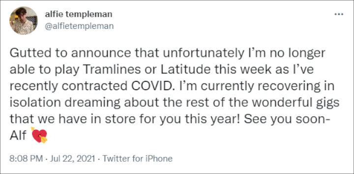 “Gutted to announce that unfortunately I’m no longer able to play Tramlines or Latitude this week as I’ve recently contracted COVID,” Templeman wrote on Twitter. “I’m currently recovering in isolation dreaming about the rest of the wonderful gigs that we have in store for you this year!”