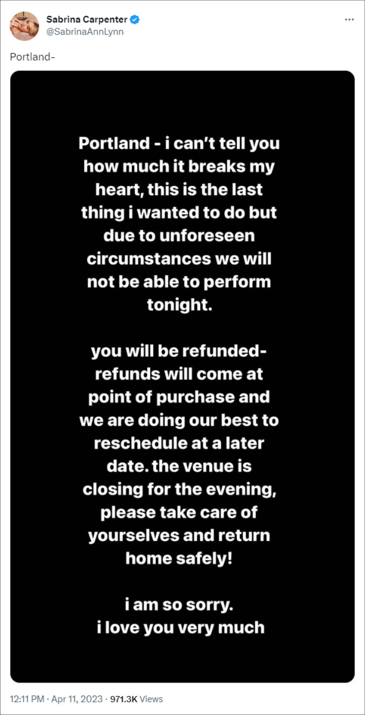 After the cancellation, Sabrina took to her Twitter account to address the matter. “Portland, I can’t tell you how much this breaks my heart, this is the last thing I wanted to do but due to unforeseen circumstances we will not be able to perform tonight,” the “because i liked a boy” songstress explained on the blue bird app. “Please take care of yourselves and return home safely! i am so sorry. i love you very much.”