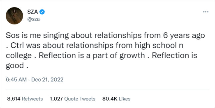 Making use of her Twitter on Tuesday, December 20, the 33-year-old clapped back at haters who claimed that she only wrote about broken heart. ” ‘SOS’ is me singing about relationships from 6 years ago,” she explained, adding, ” ‘Ctrl’ was about relationships from high school n college . Reflection is a part of growth . Reflection is good.”