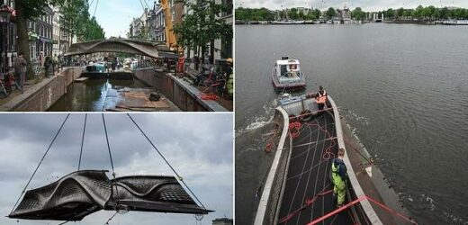 World’s first 3D-printed steel footbridge is unveiled in Amsterdam’s Red Light District where it will serve as a ‘living laboratory’ to assess the behaviour of metal printed structures