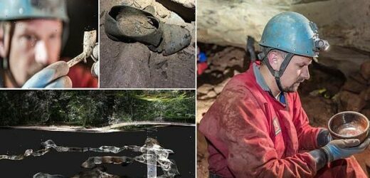 Cavers discover a pristine cobalt mineshaft at Alderley Edge that has been undisturbed since 1810 – containing clay pipes, leather shoes and bowls left behind by miners