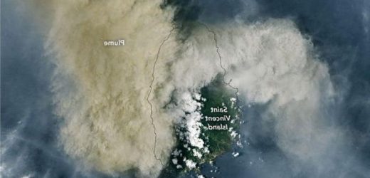 Snapshots taken by NASA’s Landsat 8 satellite show St Vincent almost completely obscured by the volcanic plume.