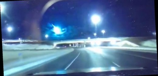 A driver's dashcam has captured the incredible moment the sky was lit green after a fireball appeared out of nowhere.