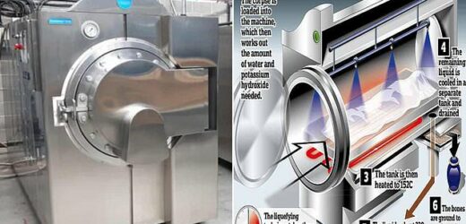 Water cremation speeds up body’s breakdown, turning all but bones into liquid. Pictured: A resomator used for water cremations