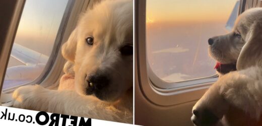 Golden Retriever puppy Louie was living his best life on his debut plane ride as his owner Amanda Vargas captured the excited pooch peeking out of the window as the sun started to set.