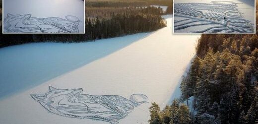 Pictured: The jaw-dropping 295ft-tall fox carved into a massive frozen lake in Finland by one man using a shovel