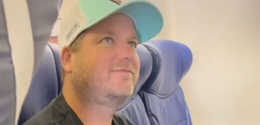 The footage shows him sitting wide-eyed in his seat, patting the empty chair to his right, suggesting the strangers boarding the flight sit next to him.