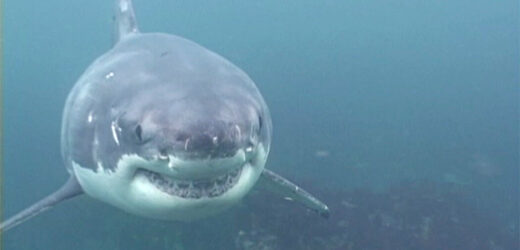 In the muffled quiet, a steady inhale-exhale. A shadow, then a flash of silver. Then the elusive subject of fascination makes its silent, gliding approach, emerging in full: the great white shark.