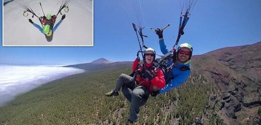 ‘I jumped off a volcano with a bloke strapped to my back’: Incredible pictures show traveller’s thrilling paragliding experience from the flank of Mount Teide in Tenerife