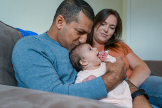 Iraqi Uber driver Thamer Alkhammat with his wife Elisha van den Brink and two-month-old daughter Amira.Credit:Joe Armao