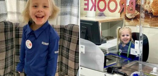THIS four-year-old fan proves every little helps as she gets to work on a Tesco till.