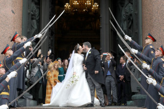 St Petersburg: Under the watch of a ceremonial honour guard, the bride walked slowly down the aisle as a flock of young attendants held her seven-metre train aloft. The groom, clad in black coattails, stood expectantly under the golden dome of St Isaac’s Cathedral as his mother watched from a throne-like marble enclosure.
