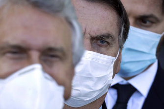 Brazilian President Jair Bolsonaro, centre, arrives for a press conference following a ministerial meeting about his government’s handling of the pandemic.Credit:AP