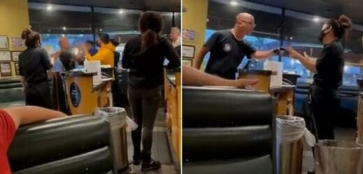 Furious anti-masker kicks off over restaurant ‘discrimination’ after waitress tells him ‘it’s a mandate’ before he’s knocked to the floor with a single punch in angry confrontation over masks