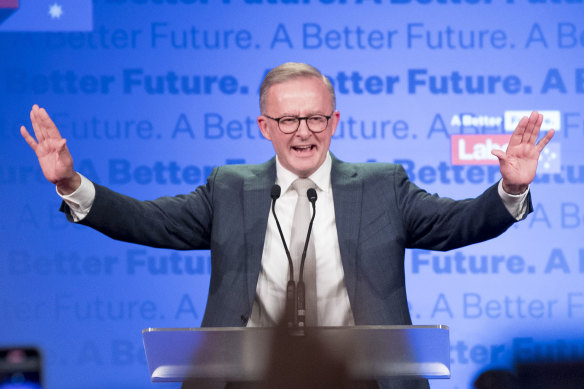 Anthony Albanese celebrates on election night in May.Credit:Brent Lewin/Bloomberg