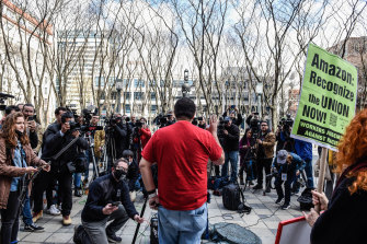 An Amazon labor organiser speaks to members of the media during the vote count.Credit:Stephanie Keith/Bloomberg