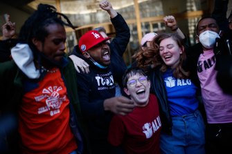 Staten Island based Amazon.com Inc distribution center union members celebrate after getting the voting results to unionise.Credit:AP Photo/Eduardo Munoz Alvarez