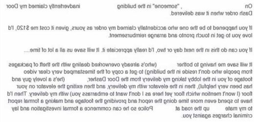 The letter accuses the neighbour of making off with a £60 wagyu beef and salt and pepper prawns order from DoorDash.
