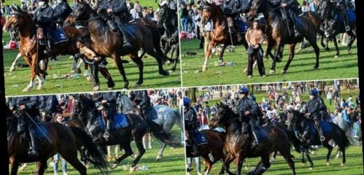Mounted police officers charged at and trampled park-goers before turning water cannons on them as thousands of revellers on Thursday.