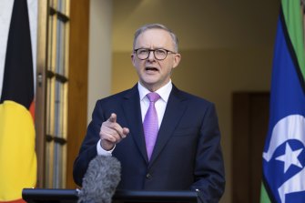 Prime Minister Anthony Albanese during yesterday’s press conference at Parliament House in Canberra.Credit:Alex Ellinghausen
