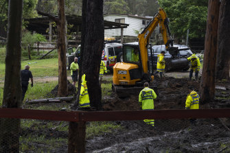 Police searching a piece of land on Monday. Credit:Louise Kennerley