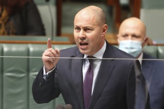 Federal Treasurer Josh Frydenberg speaking in Parliament earlier this year. Credit:Alex Ellinghausen