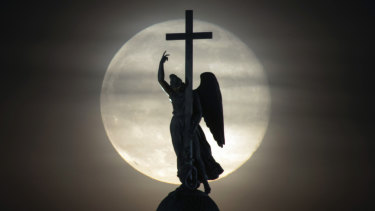 A statue of an angel fixed atop the Alexander Column at the Palace Square is silhouetted on the rising full moon in St. Petersburg, Russia.Credit:AP
