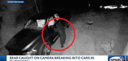 Home-security footage captured the bandit — a black bear — opening the door of a vehicle and then crawling inside.