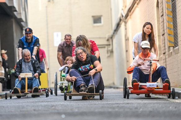 Ariel Valent, the director of North Melbourne’s neighbourhood house The Centre, organised the Queensberry Cup to inject some community celebration and bring back the art of the billycart – which was used as far back as the 1880s in Australia and was popular until about the 1980s.