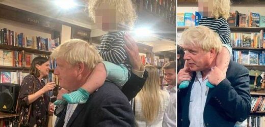 Isn’t it past his bedtime, Boris? PM gives son Wilfred a shoulder ride as he dashes to father Stanley’s book launch in London… hours after jetting back from £25,000-a-week Spanish break