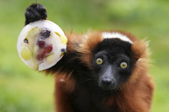 A red ruffed lemurs enjoys an ice block filled with fruit at Blair Drummond Safari Park near Stirling, England, as temperatures soared across Britain.Credit:PA/AP